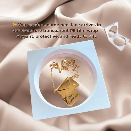 Crafted from polished 316L Stainless Steel, this delicate envelope necklace opens to reveal a hidden letter inside, engraved in subtle black text with a name or a short, heartfelt message. From “Amanda, I love you” to “Emma, Love U Forever”, every word becomes a quiet promise kept close to the heart.